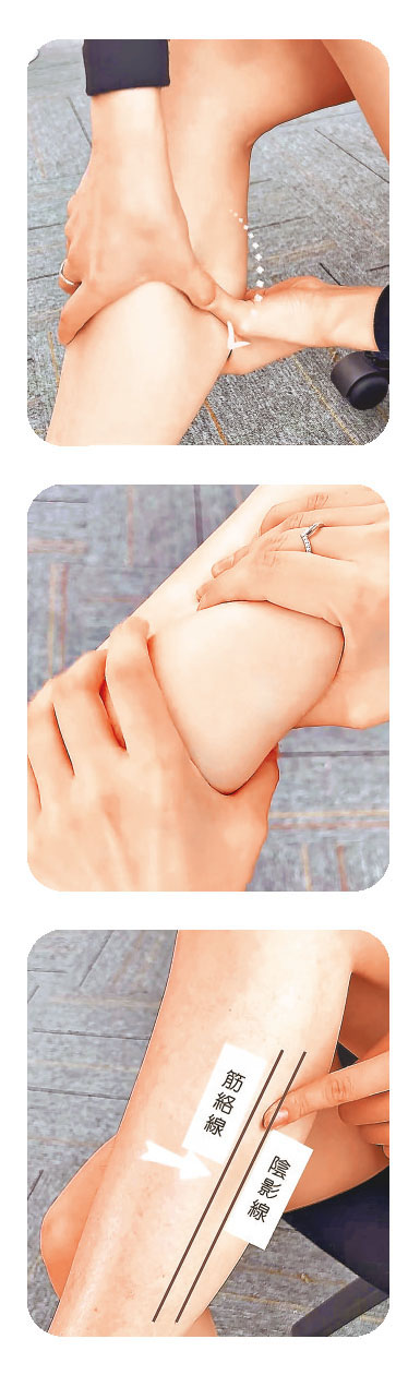1.找到小腿肉最厚的地方,用大拇指的關節,從膝蓋下方開始往小腿、腳踝方向,由上往下按,如果感受到痠脹感的話就代表按的位置是正確的。