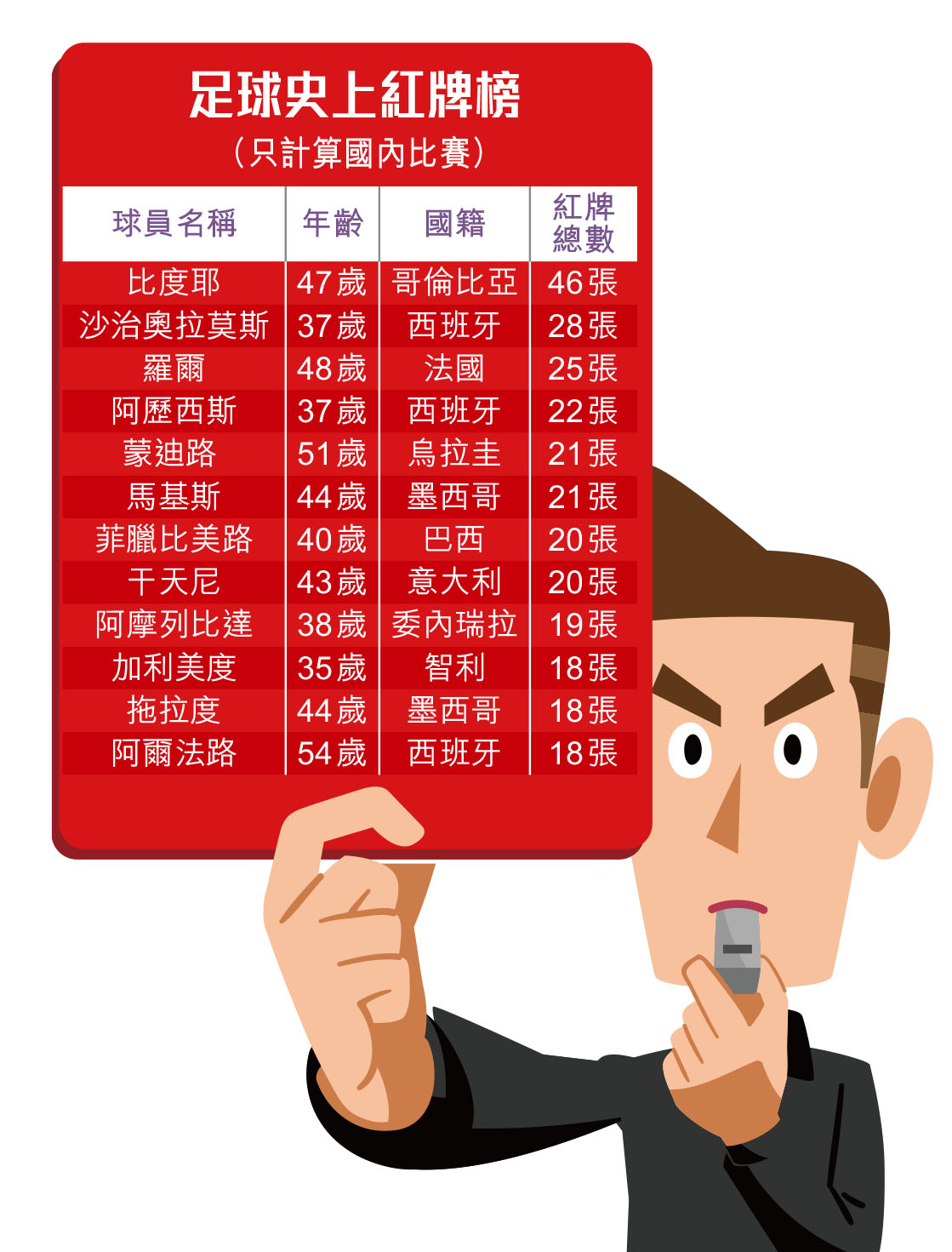 在世界足球史上紅牌榜,唯一穩贏拉莫斯的,要數現年已47歲的哥倫比亞球員比度耶。這位綽號「野獸」的防守中場,曾代表哥倫比亞國家隊49次。他在球員生涯於球會共領46張紅牌,是一個難以打破的紀錄。