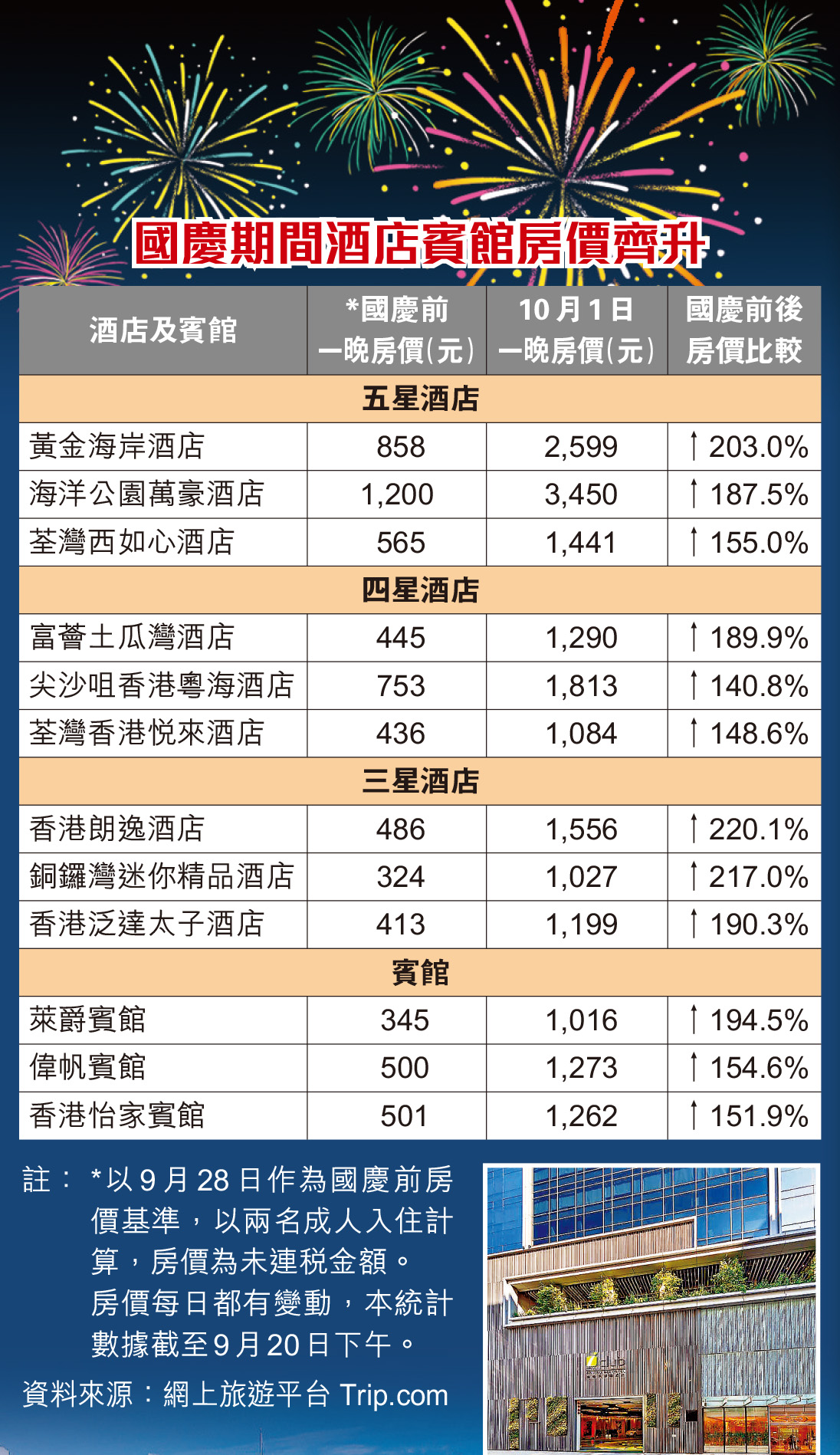 每逢內地長假等旺季,本港酒店房價更會急升。本報以本月20日的房價作基準,在旅遊網站比較國慶前的9月28日及國慶當日(10月1日)的房價變動,發現不少酒店房價漲幅介乎約一倍多至逾兩倍不等。其中屯門一間五星級酒店,兩人入住一晚,未連稅房價由858元升至國慶日當天的2,599元,升幅逾兩倍;九龍旺角及太子兩間不少內地客入住的酒店,房價則分別由480元和520元升至1,760元和1,680元,升幅近2.7倍和2.2倍;賓館房價同樣加一倍多(見表)。