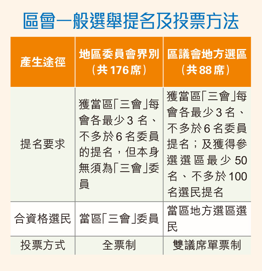 2023年區議會一般選舉將選出地區委員會界別議員(176名)與區議會地方選區議員(88名),提名的產生要求見表。