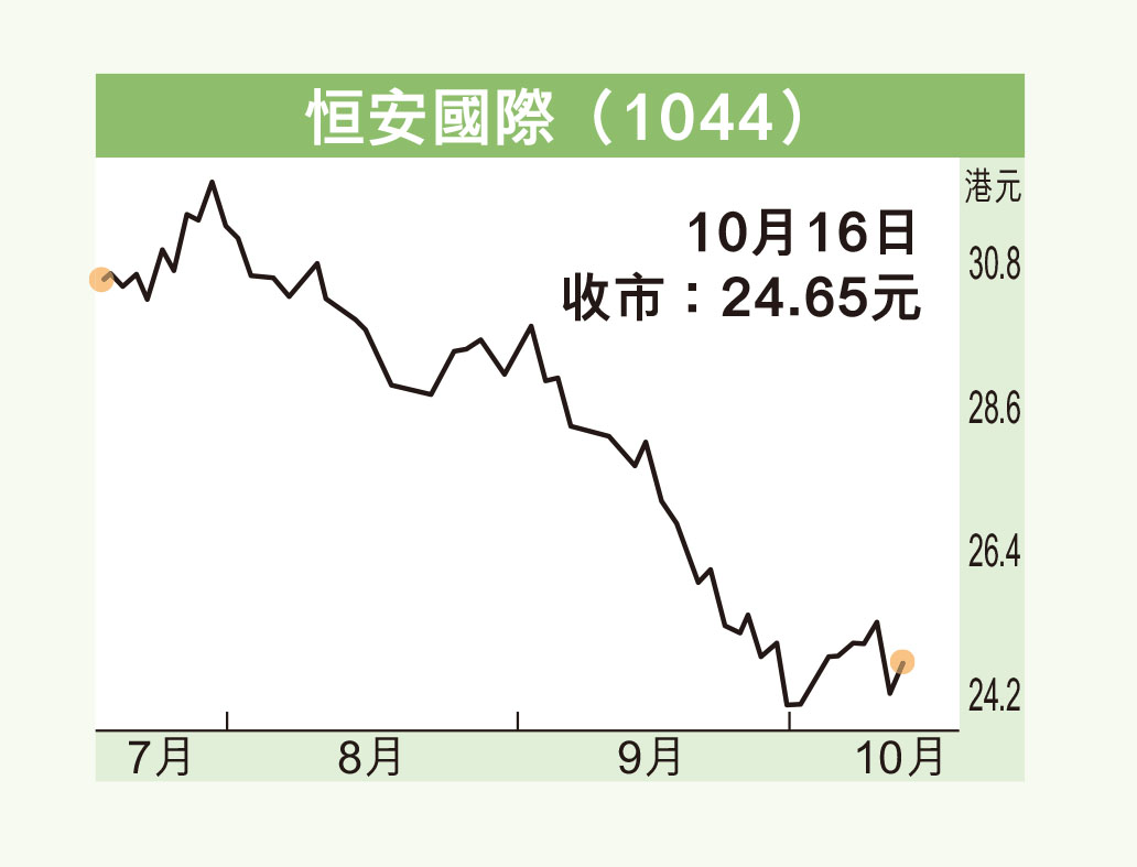 恒安昨收報24.65元(港元,下同),升0.45元或1.86%,成交額4,672.4萬元。該股過去兩個月自30.4元下跌至23.75元的52周新低始獲承接,在下半年消費增長有利估值回升,現價市盈市13.6倍,息率6厘,可收集,上望29元。