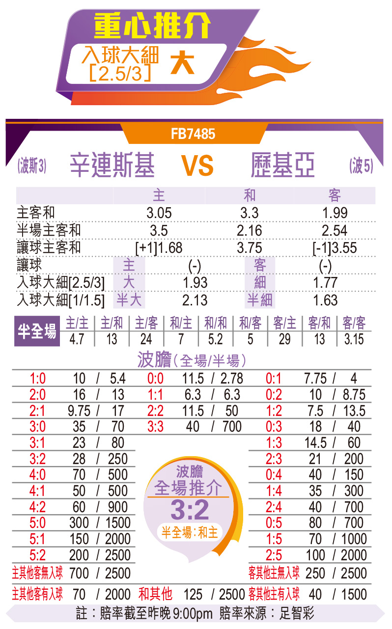 辛連斯基是歐戰陌生名字,近年參戰基本上都難跨越外圍賽,不過自從由強調攻勢足球教頭倫杜歷領軍後,球隊無論踢法及表現都令人眼前一亮。球隊贏得過去兩屆波斯尼亞甲組聯賽冠軍後,今季劍指歐洲賽,自7月中由歐聯外圍賽踢起,然後降格歐霸再降格歐協聯,終於找到突破機會。近期在聯賽留力,矢志於歐戰打出名堂,由該隊在歐聯2:3負阿美尼亞烏拉爾圖、歐霸大勝冰島比達歷克6:2,及歐協聯分組賽首戰4:3反勝AZ,盡見主場有前無後作風。今仗又在主場出擊,面對近期4連敗防線不濟的歷基亞,當然繼續瘋狂。