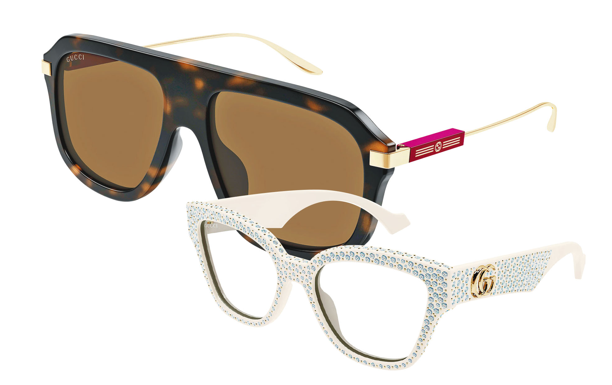 GUCCI 2023秋冬眼鏡系列全新登場的眼罩式太陽眼鏡,以渾圓的輪廓演繹品牌標誌性的Interlocking G標誌,分外奪目。粗框造型採用新穎的彎曲結構和明亮鮮色,並以鉚釘點綴,而一系列玩味十足的鏡框設計則結合大膽幾何形狀、夢幻彩色圖案和閃亮水晶,展現活潑靈動的魅力。多款精緻鏡框採用琢面設計,並於樁頭添上特大金色雙G標誌,而纖幼的金屬鏡臂則以彩色琺瑯字樣的GUCCI標誌的小方塊點綴,令人眼前一亮。系列更推出全新時尚男士款式,以混合物料打造經典方框、長方形和飛機師款鏡框,並添上琺瑯細節,展示經典紅綠織帶圖案的雋永魅力。