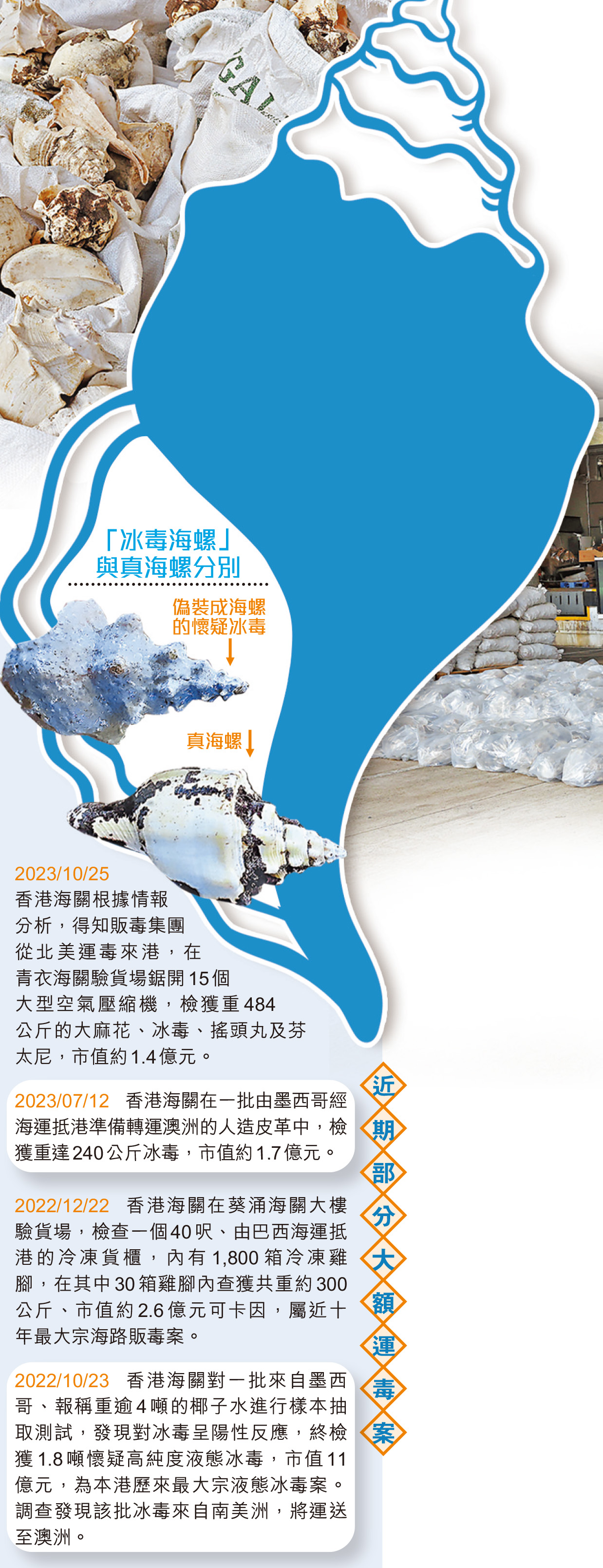 海關上月26日透過風險評估及情報分析,在葵涌海關驗貨場檢查一個由墨西哥經海運抵港、報稱運載海產製品的40呎貨櫃,開櫃後發現內有600多袋海產製品,經X光掃描發現當中104袋的影像不尋常,打開發現內載大小不一的海螺,但部分海螺的顏色和外表與眾不同,經檢驗證實是用冰毒倒模而成,外表更被塗上一層蠟質,全部共重1.1噸,市值約6.4億元,是海關歷來破獲最大宗的固態冰毒案。