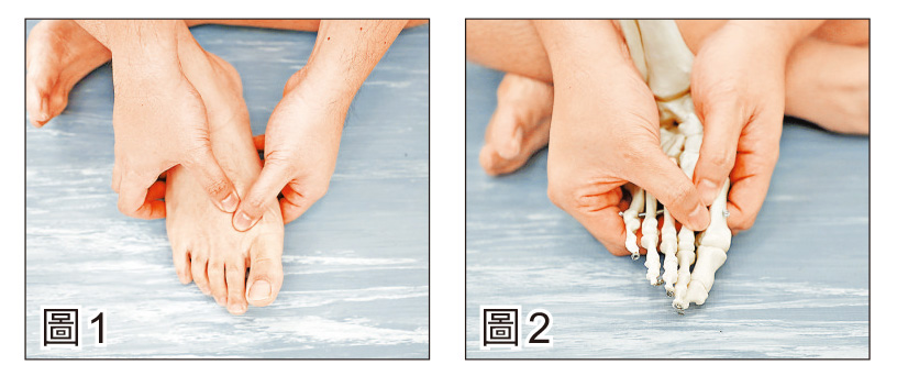 腳趾對落、腳面中心位置就是「蹠骨」【圖1】,以拇指輕輕推開或按壓蹠骨之間的罅隙,每個罅隙推/按5下【圖2】。