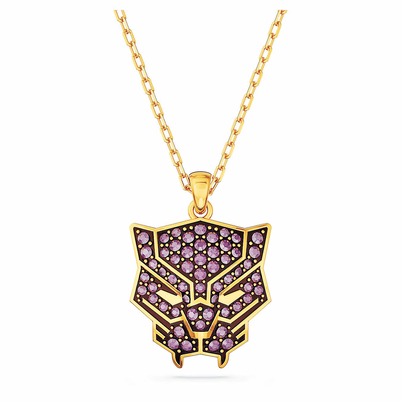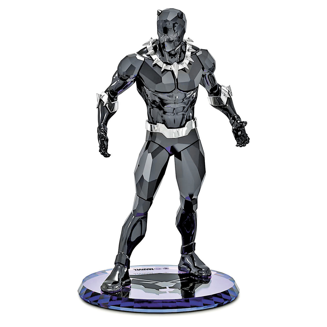 雕像高大強壯、充滿力量,是瓦干達國王的光輝寫照。依照角色標誌性黑色服裝打造的649個刻面。這一角色矗立在底座上,身着標誌性泛合金戰袍,頸戴發亮的金屬爪形項鍊,體現出超級英雄的真實氣概,是漫威粉絲的必備單品,可配搭黑豹主題首飾(包括戒指和項鍊)。