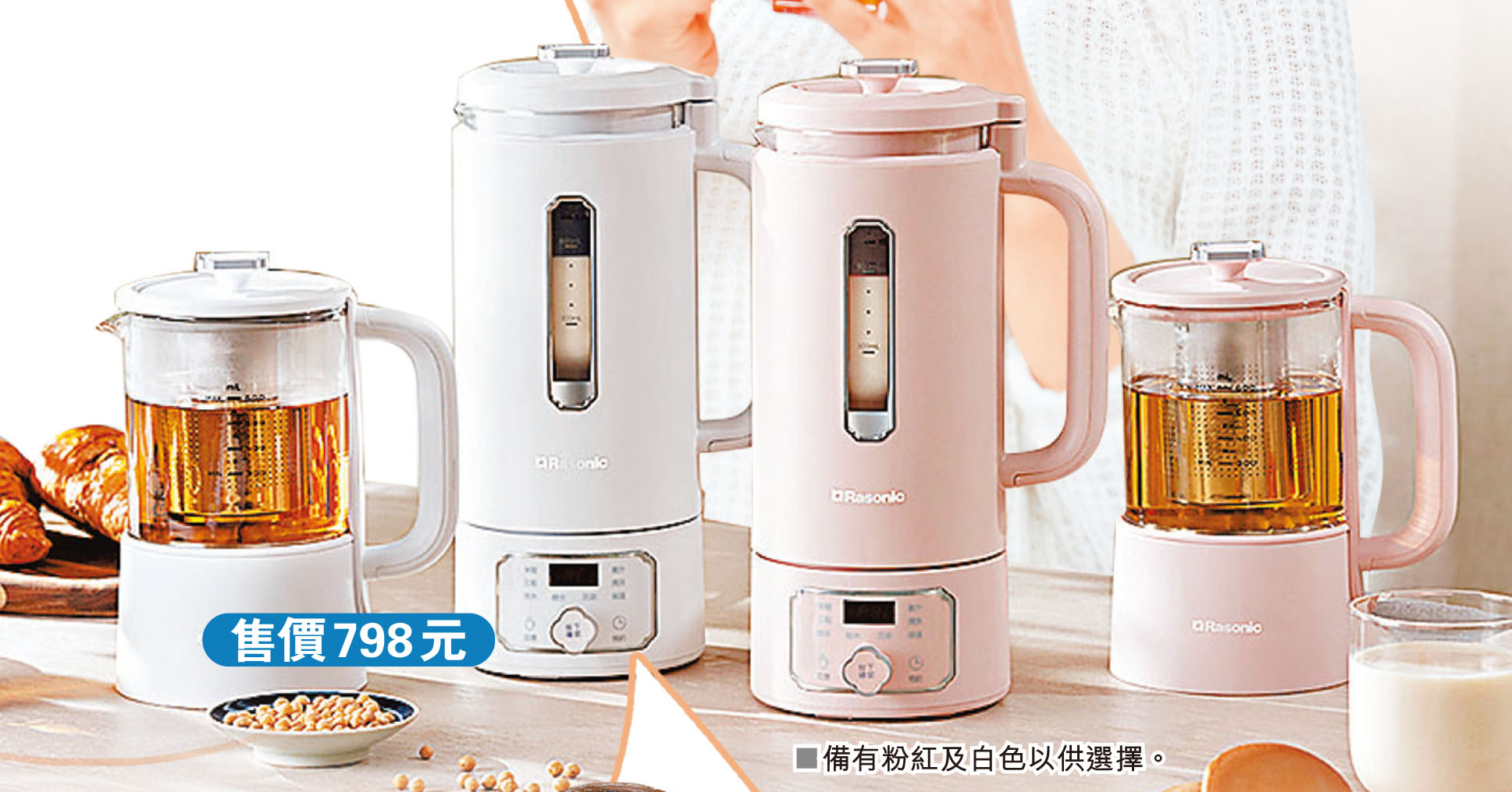 經常外出用膳的港人,使用Rasonic全新推出的花茶煮磨機,即使於上班和家中,亦能快速自製零添加養生飲品,適合追求健康的上班一族。產品設提供兩大配件:攪拌杯及花茶壺,滿足各款飲食需求。設有白及粉紅色(型號RSM-B68W及RSM-B68P)以供選擇。