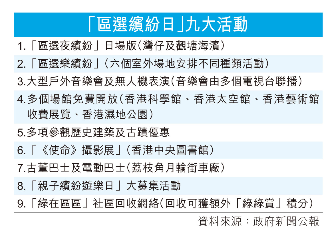 他透露,借鑑「區選夜繽紛」的有效經驗,特區政府會在12月9日分別於灣仔和觀塘海濱舉辦兩場日場版的活動。康樂及文化事務署亦會在六個室外場地舉辦「區選樂繽紛」,安排不同種類包含體育元素的活動。當晚還會舉辦一場大型戶外音樂會及無人機表演,音樂會亦會由多個電視台聯播。(見表)