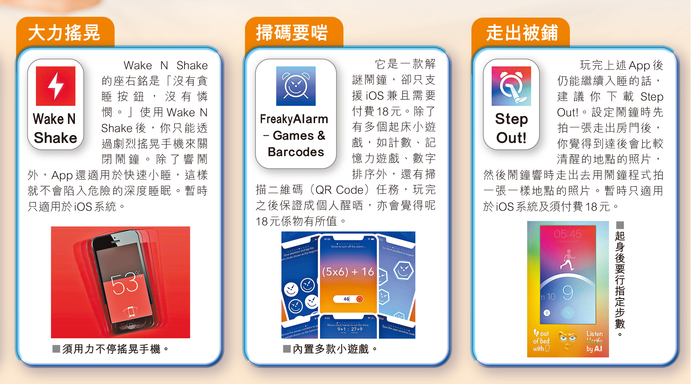 天氣開始轉涼,令不少人懶起來。每朝早一到返工返學時間,好多時候就算校了鬧鐘,被吵醒後只會將它撳停然後繼續瞓。不想因為賴床而遲到,就要留意以下手機鬧鐘應用程式(App),包括AlarmMon、Barcode Alarm、Wake N Shake、FreakyAlarm ,以及Step Out!,保證可以令大家迅速醒神,有賴床毛病的你快來下載吧。