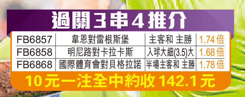 此外,南美球會盃分組賽亦進入最後一輪,C組第3位巴甲國際體育會中立場對榜首阿甲貝格拉諾。貝格拉諾已穩得首名資格,今仗例行公事早預告派副選落場,國體會要贏波之餘更希望爭取更佳得失球,力圖超越次席的SC迪爾芬,肯定開波即搶,今場主勝太熱,博半場主勝。(開賽時間:周三8:30am)
