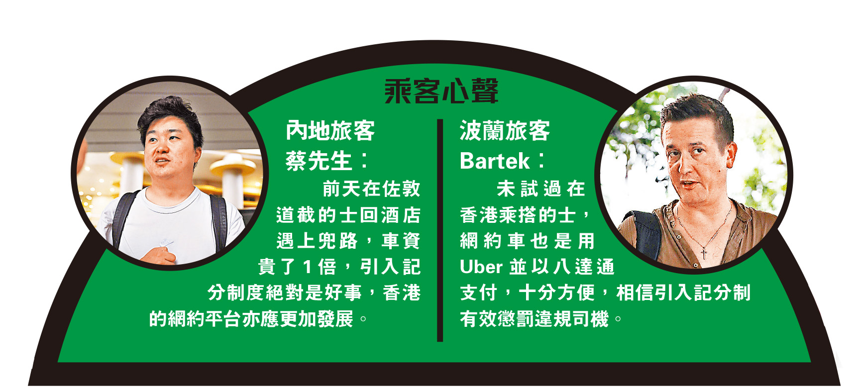 該名的士司機表示,知道業界有「黑的」存在,「主要出現喺旅遊熱點,例如從中環摩天輪上山頂按錶收費約80元,卻收旅客500元。」他認為從前的法例阻嚇力不足,「濫收車資先罰款2,000元,揸兩三轉都賺番啦!」他認為引入記分制明顯有阻嚇作用,亦認同引入記分制是好事,但同時也會為的士司機添上一點麻煩,「與乘客出現爭拗是常見之事,塞車叫你開快啲,之後又話兜路,總之有咩都賴你。就算之後證明你係清白,都要搞一大輪。」