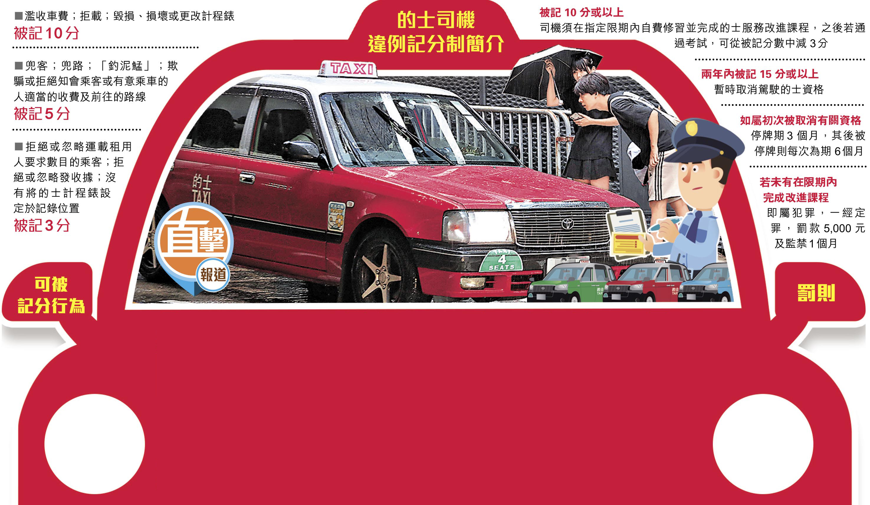 的士司機違例記分制昨起生效,的士司機觸犯濫收車費、拒載、兜路等11項相關罪行會被記分,並按嚴重性分別被記3分、5分或10分,記滿15分便要停牌3個月。本報記者昨先後到中環纜車站及尖沙咀廣東道等「黑的」黑點直擊,大部分乘客都能順利截到的士,惟記者留意到有司機「冚旗」示意不載客,但當乘客表明過海或車程較長,司機才示意上車,亦有「冚旗」司機在乘客主動表明願意多付車資後,司機才願接載,疑似利用「冚旗」掩飾揀客行為,避過記分。