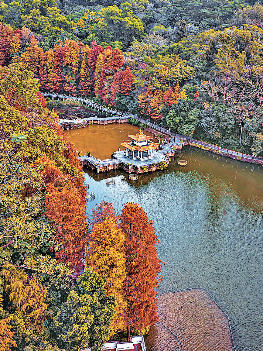 仙湖植物園坐落在深圳市最高峰梧桐山的西北山麓,西臨深圳水庫,宛如世外桃源,仙意十足,佔地668公頃,是一座集物種保育、科學研究、科普教育、旅遊休閒於一體的多功能植物園。全園分為天上人間景區、湖區、廟區、沙漠植物區、化石森林景區和松柏杜鵑景區等六大景區。遊人可欣賞到形態各異的植物花卉,還可以暢遊植物八卦迷宮和別有洞天等景點,水面平靜時可欣賞到落羽松「天空之鏡」,十分壯觀。另外,玉帶橋、水生園、步道觀景台也是觀賞金黃色落羽杉的好位置。成人全價票每位15元,兒童半票每位5元。