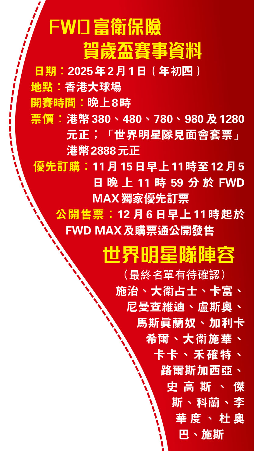 上屆叫好叫座的「FWD富衛保險賀歲盃」明年載譽重來,將於2025年2月1日(年初四)於香港大球場舉行。除了巴西名宿「李三腳」李華度將再度來港獻技外,曾奪得世界盃冠軍的前世界足球先生卡卡及另一前巴西隊長卡富亦會來港,加上「魔獸」杜奧巴、「曼聯經典」傑斯及史高斯等英超傳奇球星,勢將掀起搶飛熱潮,有望重現昔日賀歲盃全場爆滿的盛況。