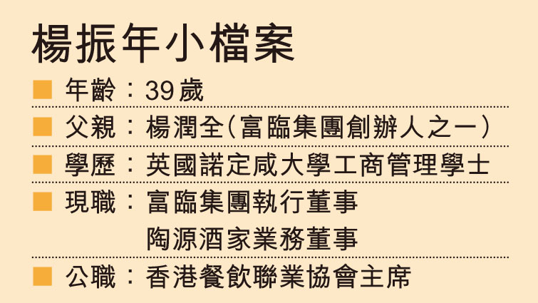 在2008年金融風暴後學成回港,楊振年翌年就正式加入富臨集團。他形容自己目標很清晣,就是為了公司轉型。然而,面對刻下酒樓業前路茫茫,楊振年慨嘆道,疫情後的今日,市民北上消費外,生活習慣也改變,晚間少出外食晚飯及消遣。他並指,市民少了光顧酒樓,晚飯轉食自助餐,又或者日本菜、韓國菜和泰國菜等等。所以說,酒樓生意前景不及以前,營運也愈來愈困難。