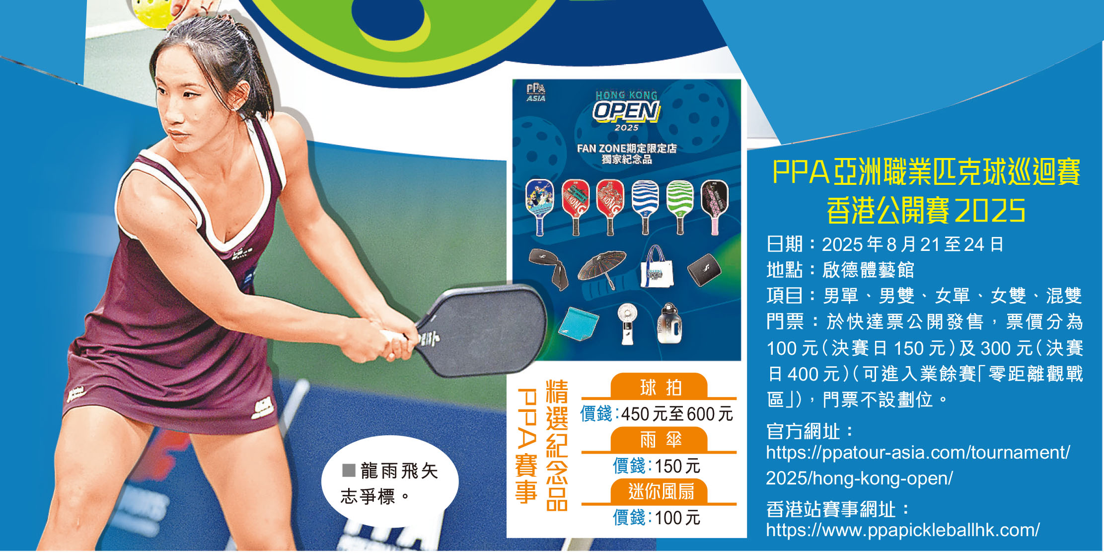 今次香港公開賽,從網球轉戰匹克球的前網球港將王康傑將首次於主場出戰,聯同PPA亞巡賽一姐、國手龍雨飛攜手爭標。觀眾除可欣賞本地球員英姿,場館亦特別設置免費的開放式球迷專區,當中設有兩個匹克球場,公眾除可踏足賽場一試身手,更可在指定時段接受教練指導,感受匹克球魅力。同場並設有多個主題攤位,出售匹克球裝備與賽事紀念品,無論是資深球手或初次接觸的新朋友,都能找到屬於自己的匹克球樂趣!