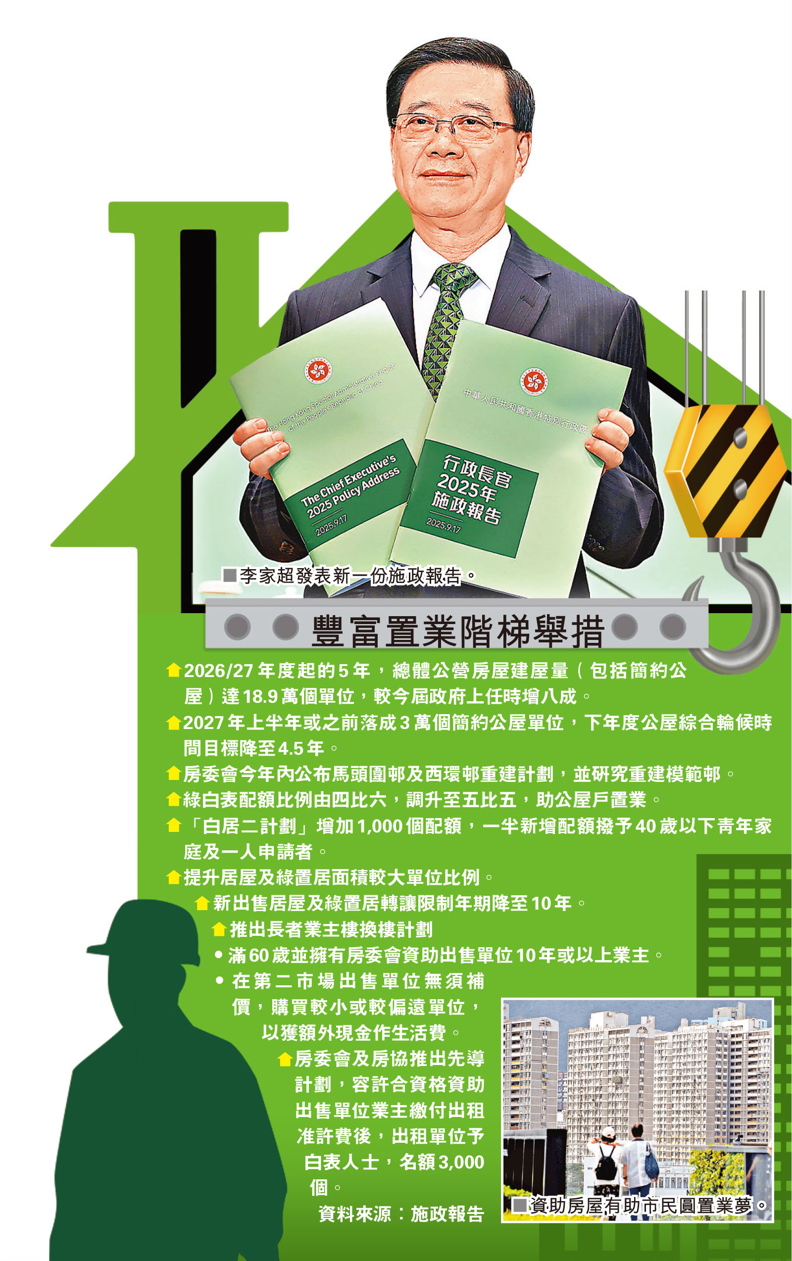 李家超昨日表示,由2026至27年度起的5年,總體公營房屋建屋量(包括簡約公屋)將達18.9萬個單位,較其上任時增加約80%。3年前,公屋申請者平均要等候6.1年才可上樓,經過本屆政府3年多的努力,公屋綜合輪候時間已縮短整整一年至5.1年,進一步邁向2026至27年度下降至4.5年的目標。對「劏房」戶來說,早一年入住公屋或「簡約公屋」,不但可改善居住環境,更可分別節省平均每年約3.6萬元或5萬元的租金。