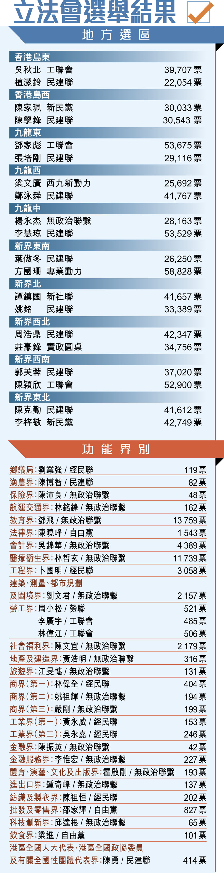 在當選人的政治聯繫方面,民建聯繼續成為最大贏家,共有20人當選,較現屆多一人,仍保持10個地方選區各有一人當選的格局;功能界別有兩人當選,比第七屆立法會少兩人,選委會界別則有8人當選,比第七屆多3人。