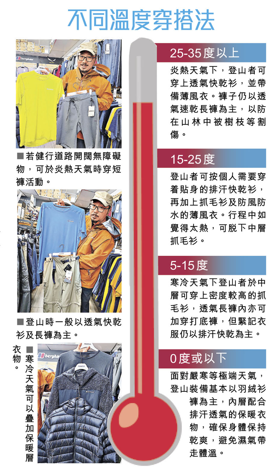 無論是新手或是老手,都不應兩手空空就去登山,除了物資要準備妥當,衣着亦要配合環境氣候。Sunny指登山衣着首要是讓人保持乾爽:「Keep Dry Keep Warm,無論是雨水或是汗水,潮濕環境都會大幅加快熱量流失,因此無論天氣冷熱,保持衣物乾爽都是保暖的重點。」在登山時,正確利用「分層穿衣法」就能有效調節體溫,亦能兼顧山野活動的靈活性。