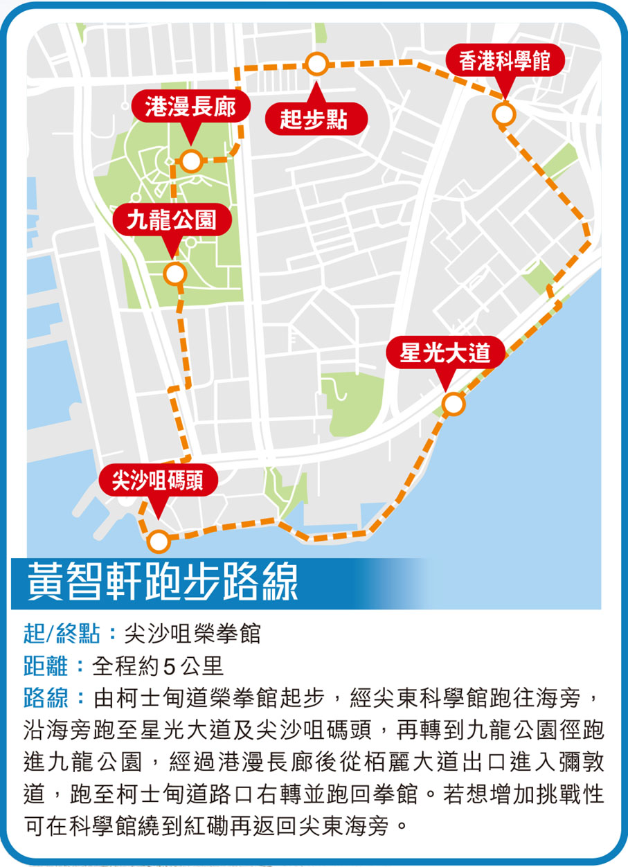 Justin的跑步路線從佐敦榮拳館出發至尖東,再繞回拳館結束,他透露途中若有緣更會發現「彩蛋」:「從拳館沿柯士甸道往尖東途中,會經過入口有一尊炮台的佐敦里,還有九龍公園內亦有不少流浪貓,若天氣好亦不時能發現貓蹤!」