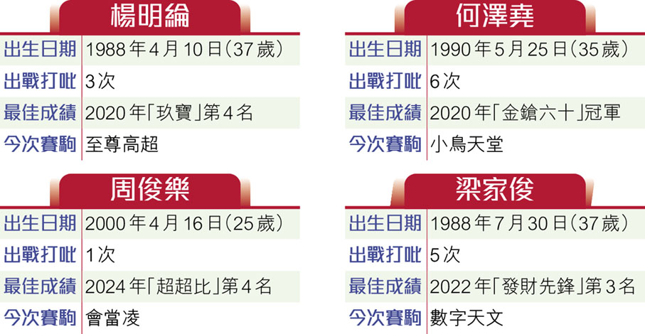 說回今屆賽事有份列陣的4位華將,何澤堯曾6戰打吡,以「金鎗六十」拿下一勝,經驗最多。梁家俊則是歷來5戰,2022年憑「發財先鋒」走入季席,取得交代。周俊樂前年騎「超超比」是唯一出賽經驗,跑得第四亦不失禮。楊明綸過去三度參戰,於2020年憑「玖寶」跑入殿軍,力保華將名聲。