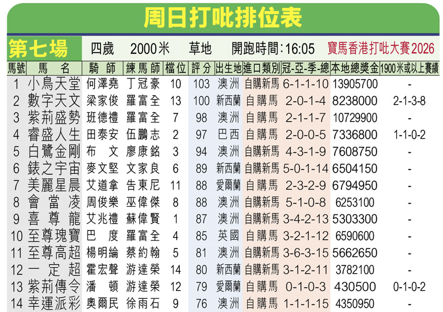 可幸,輪到今年終於東風再起,華將抬頭,包括「小鳥天堂」將會夥拍何澤堯出戰,「數字天文」則是梁家俊坐騎,「會當凌」是周俊樂戰駒,而「至尊高超」則選上了楊明綸執韁;值得一提,今次賽事最高分兩駒,正是「小鳥天堂」與「數字天文」,也意味着兩匹華將賽駒都是奪標機會最高,有望重演2020年何澤堯夥拍傳奇馬王「金鎗六十」稱霸的場面。